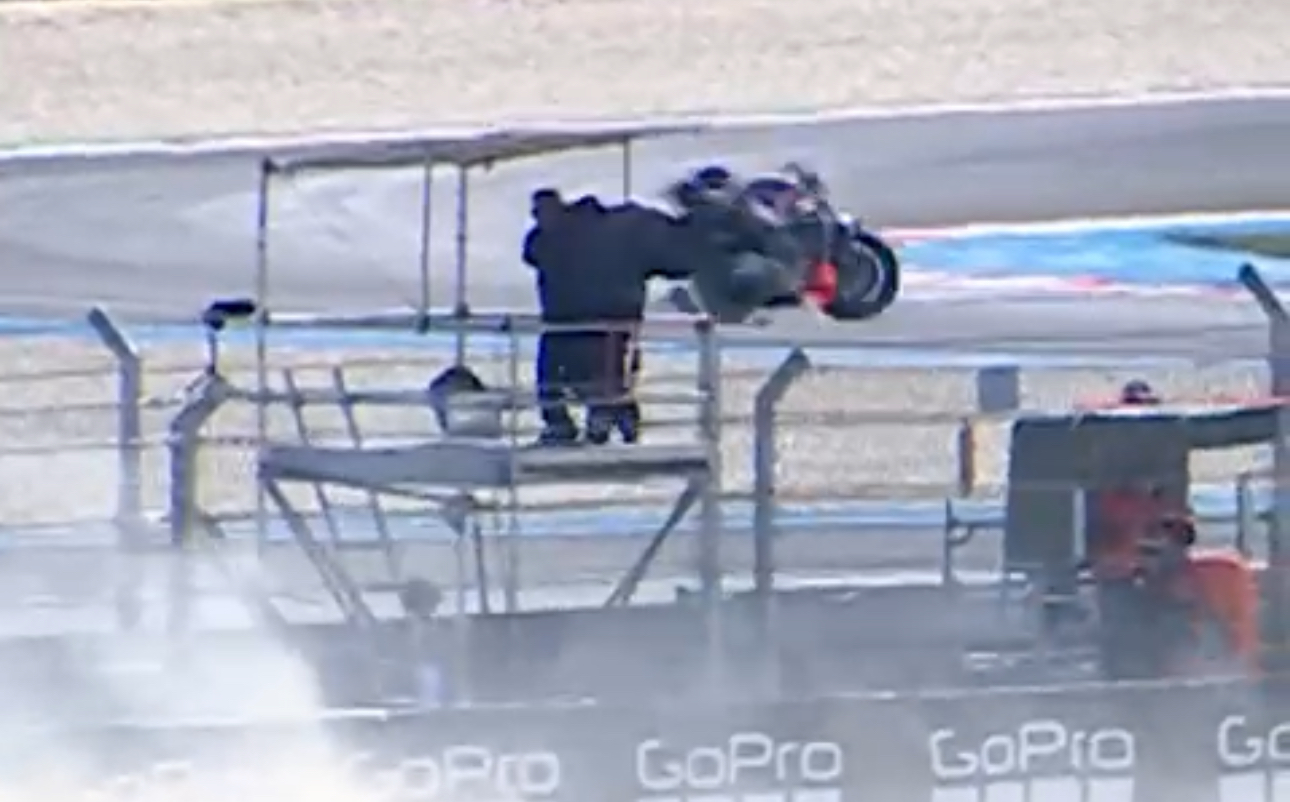Een bizarre crash, zo kan de crash van Pedro Acosta zaterdagmiddag tijdens Q2 van de Michelin Grand Prix of Hungary het beste worden omschreven na het zien van de zaterdag aan het einde van de dag door Dorna vrijgegeven beelden. Kon de Red Bull KTM Factory Racing coureur zelf ongedeerd terug keren naar de pitbox, zijn KTM RC16 liep daarentegen veel schade op. De motor vloog hoog door de lucht en kwam terecht op een langs de baan staande camera van de MotoGP organisatie. Cameraman Joao kreeg de KTM bijna op zijn hoofd, maar kwam met de schrik vrij.