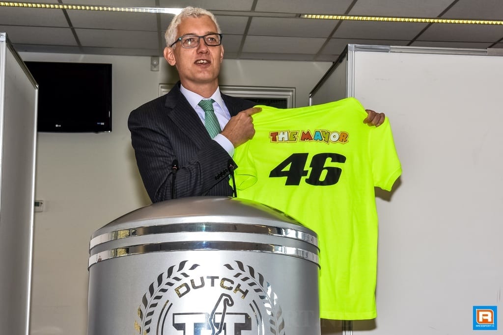 Burgemeester Out, groot fan van Valentino Rossi, sprak de hoop uit dat er in de toekomst een Drentse coureur op het podium komt bij de TT en zinspeelde op een rol die voor Dion Otten weggelegd kan zijn. De presentatie van de burgemeester van Assen was één van de programmaonderdelen van de Vriendendag.