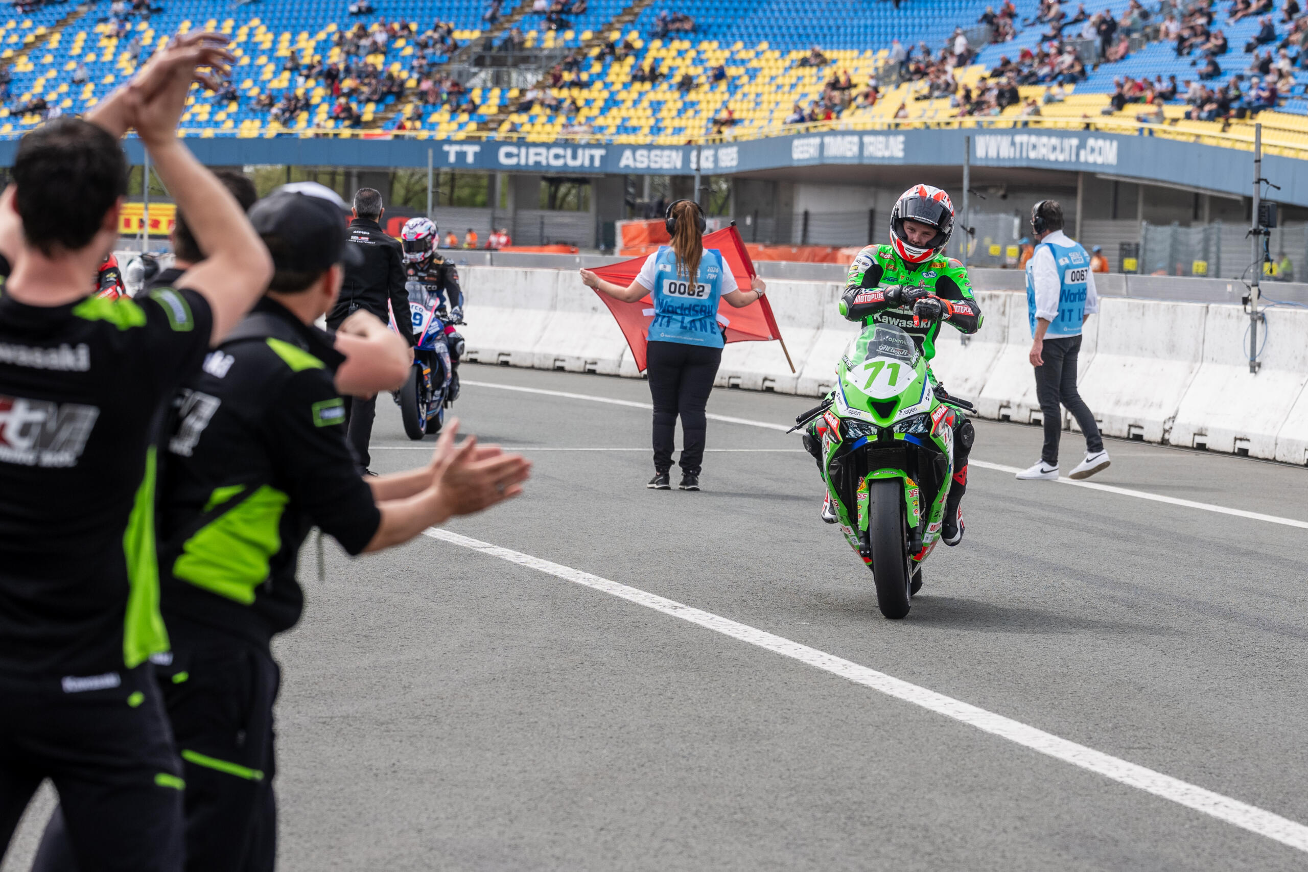 Ik durf hem na vandaag wel aan; het zou mij tegenvallen als er dit weekend geen Nederlander wint in één van de twee World Sportbike-races. Loris Veneman, Jeffrey Buis en Kas Beekmans hebben vandaag mooie reclame gemaakt voor motorsportfans om zaterdag en/of zondag naar het TT Circuit Assen te komen. Loris pakte pole position, Jeffrey eindigde als tweede en Kas als vierde in de Superpole. Een perfecte uitgangspositie voor de eerste race van zaterdag. Mijn vertrouwen in een Nederlandse overwinning steeg nog verder toen ik drie jonge Nederlanders had gesproken. Blije gezichten, vol vertrouwen. Alle drie hebben ze het gevoel voor de overwinning te kunnen strijden, al was Kas daarin nog het meest voorzichtige van het trio.