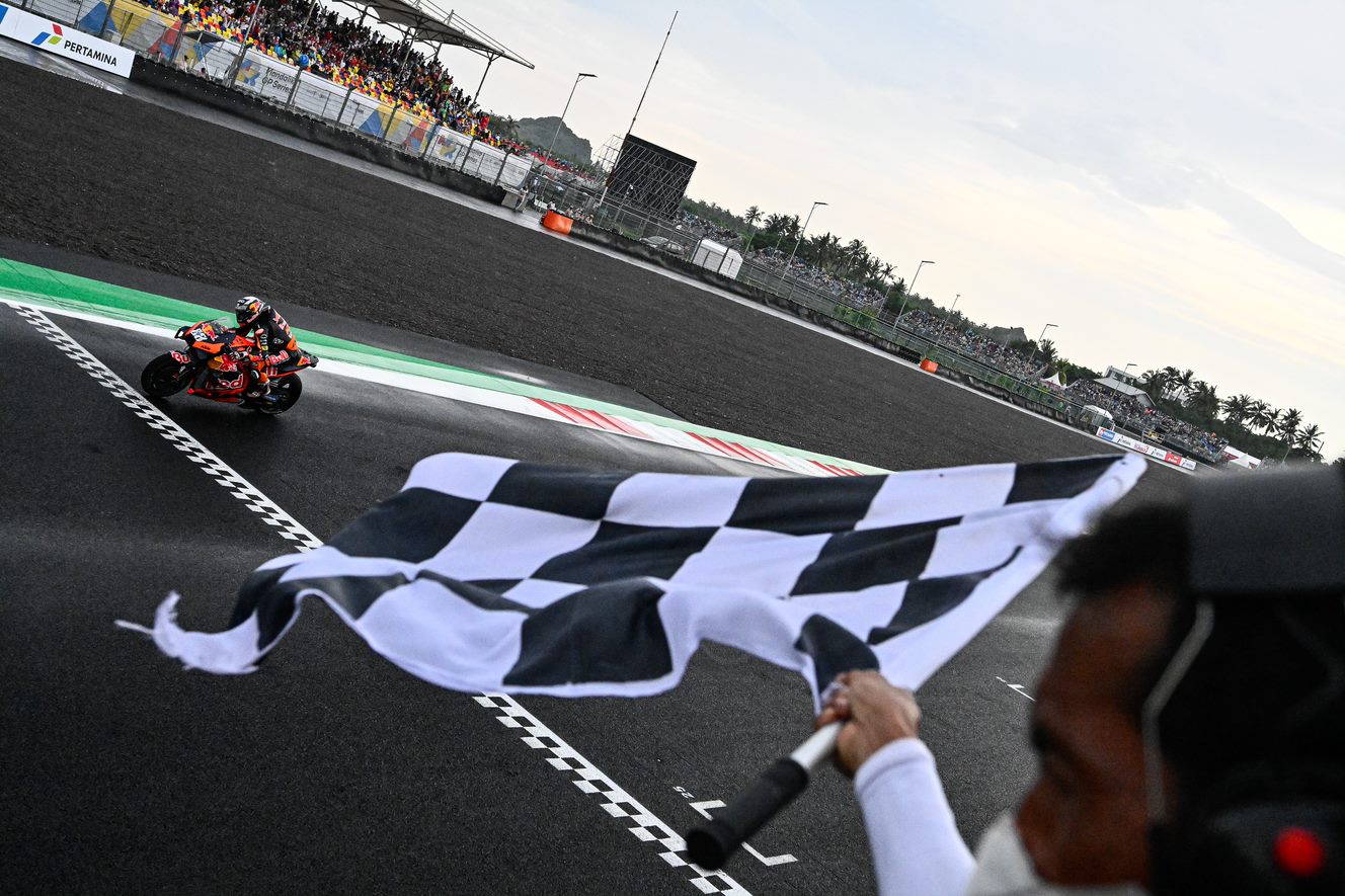 Miguel Oliveira heeft zondag de Grand Prix van Indonesië gewonnen op het Pertamina Mandalika International Street Circuit. De MotoGP race werd uitgesteld vanwege hevige regenval, de Portugees bleek oppermachtig en won voor de Fransmannen Fabio Quartararó en Johann Zarco.