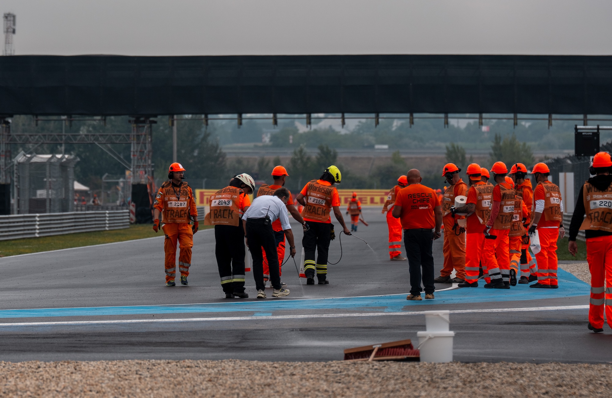 De warm-up sessie werd kort voor het einde stilgelegd nadat Michael Ruben Rinaldi zijn machine de geest gaf en een flinke oliespoor achterliet op de natte baan. Hoe lang de schoonmaakwerkzaamheden gaan duren is nog niet bekend, maar dat dit klusje niet in een poep en een scheet geklaard zal zijn is wel duidelijk.