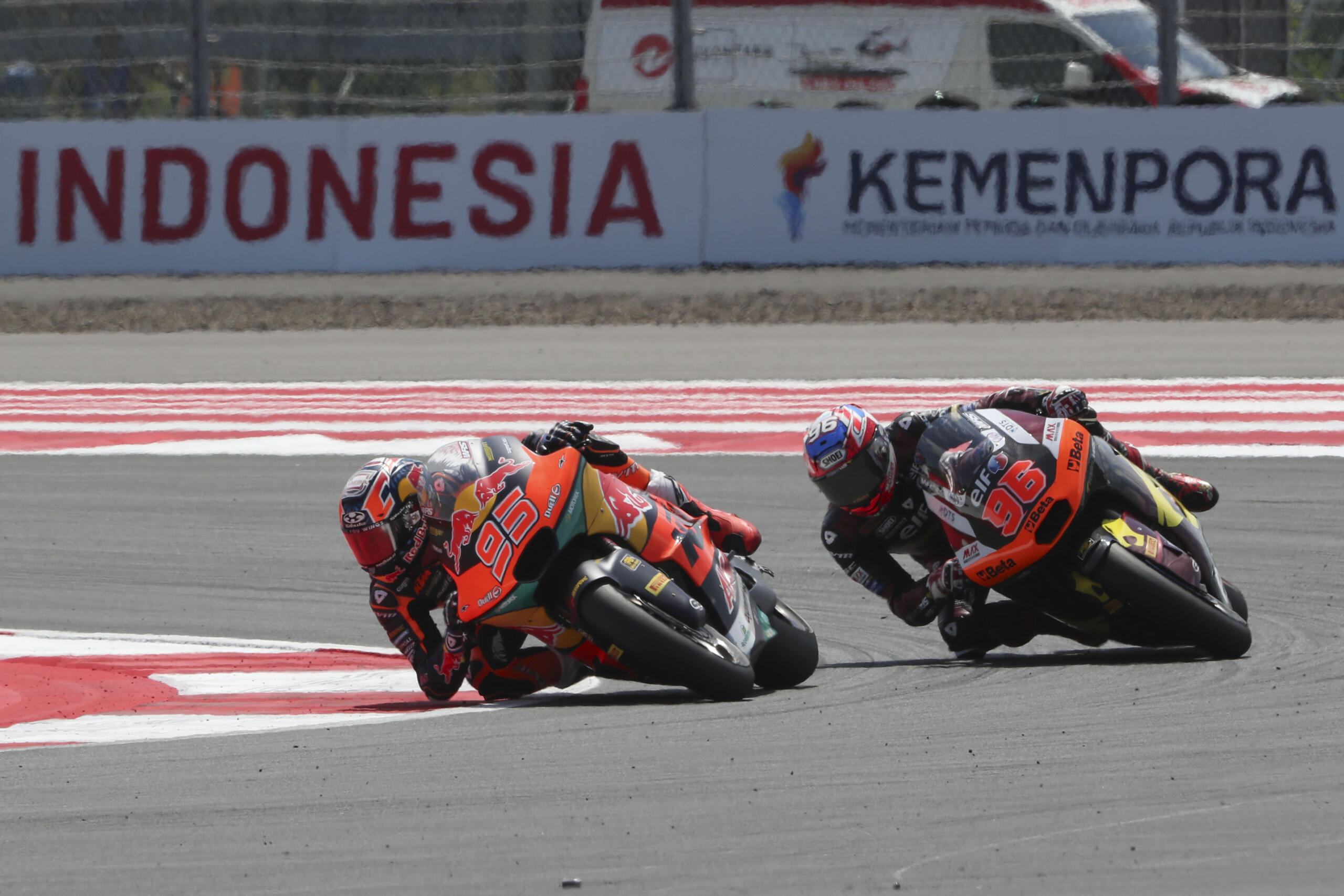 Onder extreme omstandigheden – met 60°C baantemperatuur en 75% luchtvochtigheid – vertrok Collin Veijer zondagmiddag op het Pertamina Mandalika International Circuit vanaf de zevende plaats op de grid. Zijn start verliep echter niet vlekkeloos: hij liet de koppeling te snel opkomen en zakte terug naar de dertiende positie. Even later verloor hij nog een plek, waarna hij in zijn eigen tempo begon aan een gestage opmars.